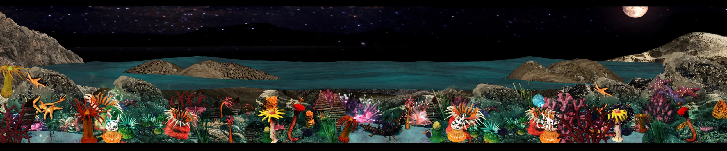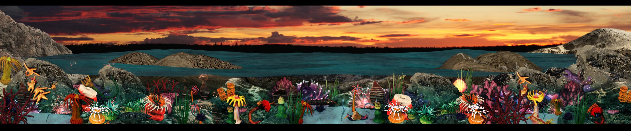 Coastal Terrarium is a 3-screen panoramic video installation illustrating a cross section of the north pacific coast waters where the artist grew up. The work combines photo-collage, live-action video, 3D modelling using photogrammetry, and stop-motion animation sea creatures composited in After Effects.